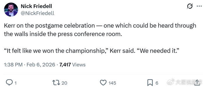 虽然对球队排名影响不大,但对于处于下行势头的勇士队来说,这一场含金量十足的胜利无异于一剂强心针。