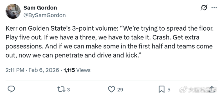 而勇士队之所以能够拿下胜利,主帅科尔的变阵与用人成为关键,半场疯狂出手37记三分创造NBA历史纪录,半场在篮下0-3英尺仅出手5次,只造成了一次投篮犯规,可谓是将对于三分投射的依赖发挥到了极致。