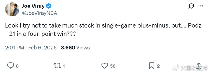 面对波杰这样的表现,勇士记者Joe Viray赛后都不禁吐槽道:“我一般不在意正负值,但波杰在球队赢了4分的情况下,正负值竟然为-21?”