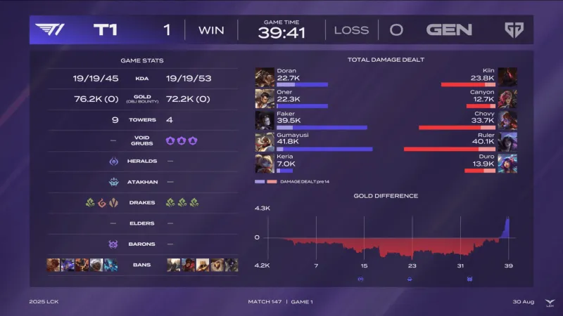 虎扑08月30日讯 【GAME1】T1蓝色方、GEN红色方